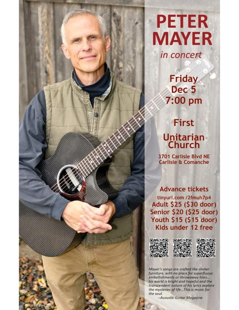 Proceeds from the Peter Mayer concert will benefit First U’s community programs to better the lives of our neighbors. Hope you can join us. The QR codes for the tiered ticket links are on the flyer, or you can go to First U’s Giving Page at www.tinyURL.com/2fmuh7p4.