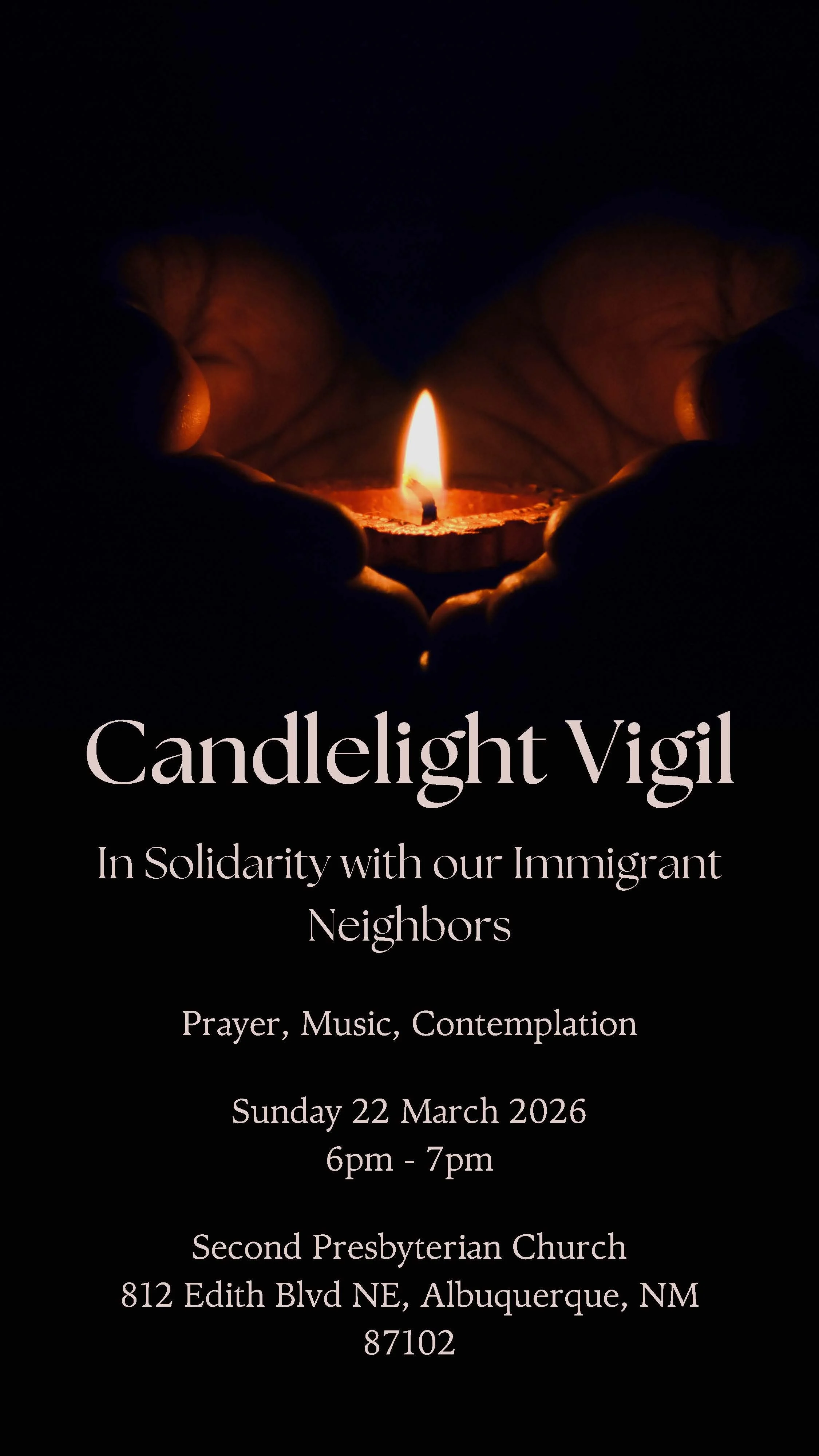 A Candlelight Vigil, in solidarity with our immigrant neighbors, will be held at Second Presbyterian Church, 812 Edith Blvd. NE, Albuquerque, NM, on Sunday, March 22, 6:00-7:00 p.m. We invite you to join us, or to host a vigil at your church, on this date and time. We do this in solidarity with singing resistance groups throughout our nation, and around the world, who are saying NO to the cruelty of government actions towards refugees, immigrants, the displaced, and those held in detention centers. We stand in solidarity with those killed or injured while exercising their constitutional and human right to protest. Future vigils are planned for the Sunday closest to Summer Solstice, Fall Equinox, and Winter Solstice. . . “♪and the world is about to turn. . . ♪”