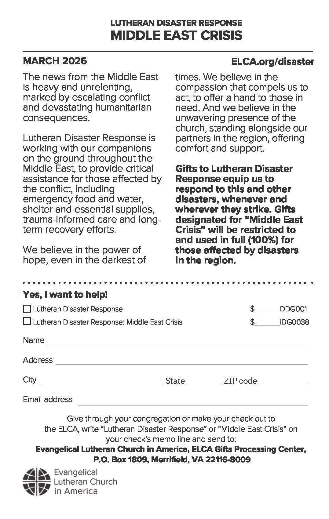 Midweek Lent Soup Supper & Bible Study continues this Wednesday in the Fellowship Hall through 25 March. (Come see our renovated kitchen!) We’ll begin at 6pm with a table grace, share soup and conversation, and then around 6:45pm begin Bible Study. We are using the Body of Christ, ELCA Sumud 2026 Lent Devotional Series (found at https://resources.elca.org/), which focuses on our siblings in the Evangelical Lutheran Church in Jordan and the Holy Land. Our time will be wrapped in song and prayer and we’ll be on our way around 8pm. A sign-up poster for setup/cleanup and food is in the Welcome Center. I look forward to our time together! Peace, Pr. Koppel