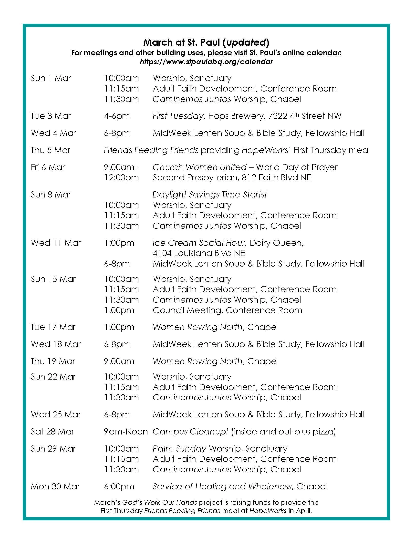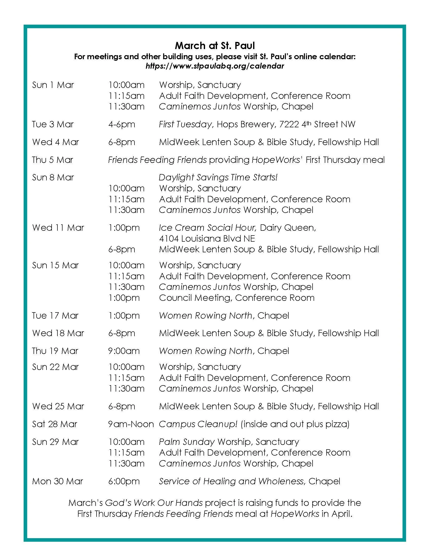 March’s God’s Work Our Hands project: We are collecting funds for the Friends Feeding Friends First Thursday meal on 3 April at HopeWorks. On your check to St. Paul, please note FFF April in the memo line. Thanks! ~Deborah Ash & Nancy Jenkins