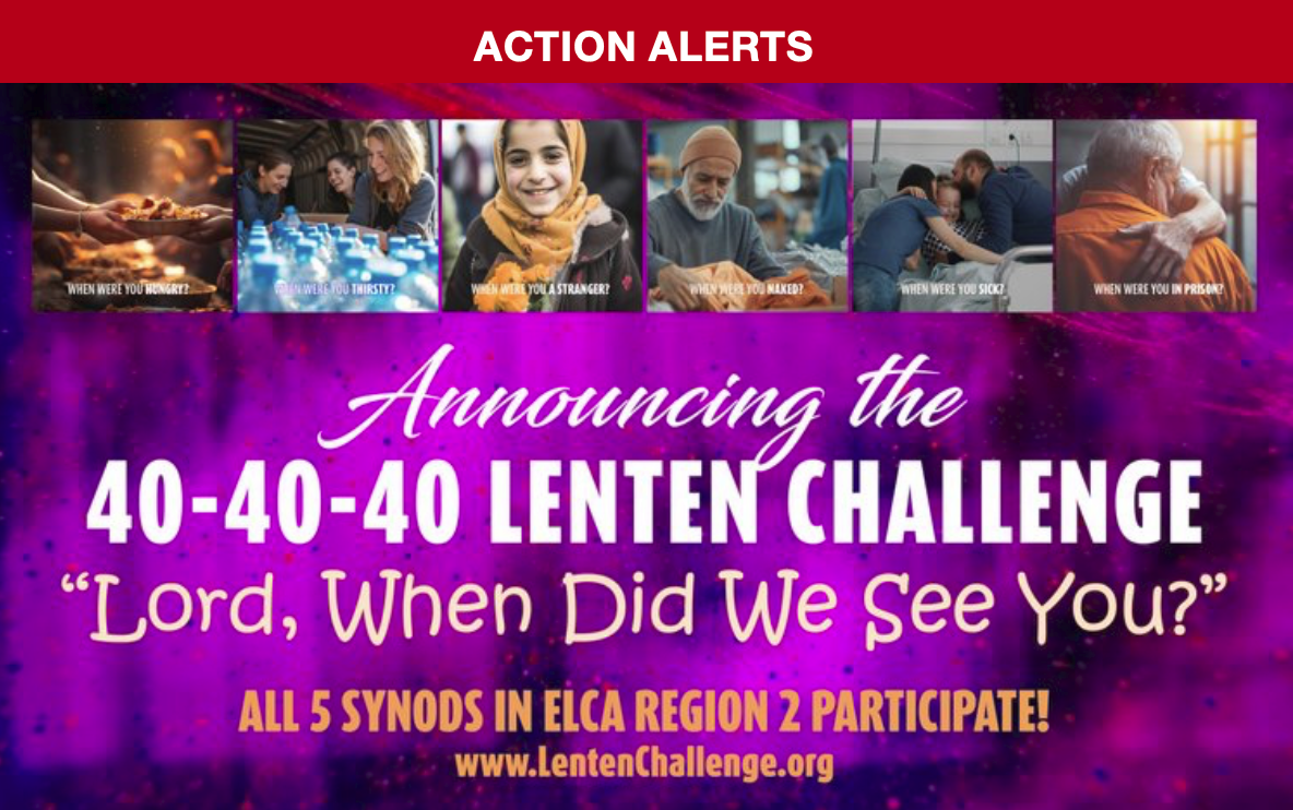 This year’s theme—“Lord, When Did We See You?”—invites individuals, families, congregations, and organizations to commit to 3 of 4 practices (Devotions, Learning, Action, and Donation) throughout Lent, while together aiming to raise $100,000 for ELCA World Hunger—supporting sustainable solutions that address the root causes of hunger and poverty. Visit: https://lentenchallenge.org/