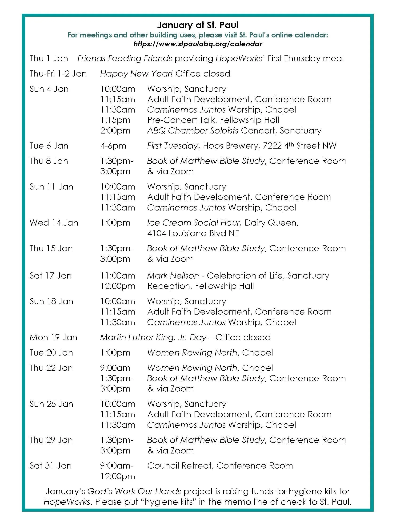 God’s Work Our Hands: For our January project, we are collecting donations towards hygiene kits for HopeWorks. On your check to St. Paul, please put “hygiene kits” in the memo line. Thank you! ~Deborah Ash & Nancy Jenkins