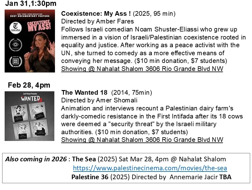 From Jewish Voice for Peace: Albuquerque Weekly Silent Vigil for Palestine. Every Sun from 12 PM to 1 PM, Location TBD weekly. The vigil is somber and silent to bring awareness to the ongoing and worsening genocide and ethnic cleansing in Gaza and the West Bank. We remember all lives lost and call for immediate unrestricted humanitarian aid to Gaza, a permanent ceasefire, an arms embargo of Israel, and release of all hostages and political prisoners. We have signs, but feel free to bring your own. For more information, please contact Dina at dina.afek@gmail.com or Rebeca at rebecajeff@yahoo.com.