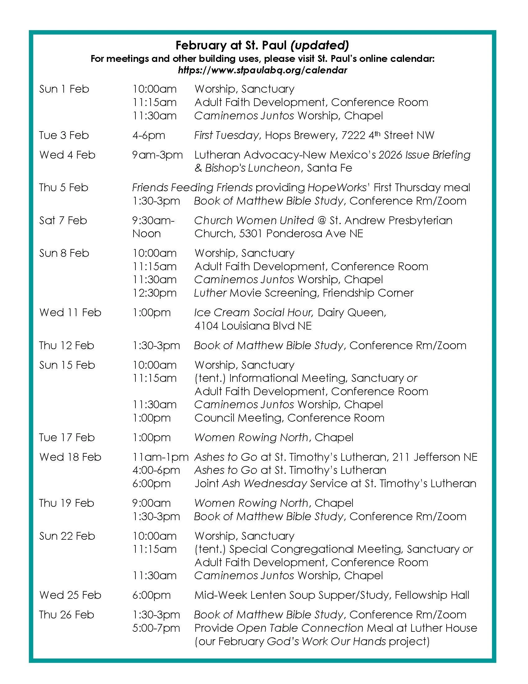 God’s Work Our Hands: For our February project, we are providing the Thursday 2/26 meal at Luther House for the Open Table Connection gathering. Please see the signup sheet in the Welcome Center to bring a side dish, salad, or dessert to share, and consider staying to take part in the conversation! We will take care of the main dish. Thank you. ~Deborah Ash & Nancy Jenkins